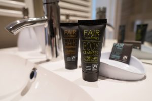 Every apartment provides guests with body care products such as soap, shampoo, conditioner and body lotion. We offer premium products called FAIR CosmEthics from the ADA’s cosmetics line, made with fair trade-certified ingredients such as cane sugar and Brazil nut oil. Fair trade has the significant aim to improve social, economic and environmental conditions of farmers and workers in developing regions in Africa or Asia. Because of the poor living conditions and poverty in certain, fair trade-production follows strict principles regarding modernized farming methods, better living and working conditions, fair payment and a better future in general.